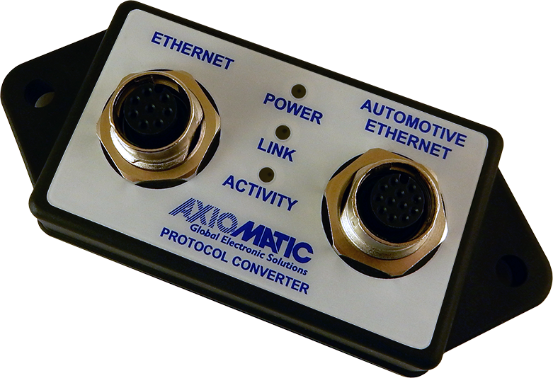 The Axiomatic Gigabit Automotive Ethernet to Ethernet Converter provides a purely physical, bi-directional conversion between Automotive Ethernet (1000BASE-T1), and Ethernet (1000BASE-TX) via PHY transceivers. No packets are stored or modified in this device. The converter supports a baud rate of 10, 100, and 1,000 Mbit/s. Status LEDs provide information on connection link, and communication. The converter is designed for the harsh environments of offhighway or industrial equipment. Automotive Ethernet networks use a 2 wire, unshielded, twisted pair (UTP) cable. Using Automotive Ethernet saves cabling costs for the machine builder. The unit will be configured via the RS-232 port to act as a Master or Slave for Automotive Ethernet. The Master mode works if the connected device has its transceiver set to slave mode. The Slave mode works when the connected device has its transceiver set to master mode. Hard setting the master/slave relationship saves on setup-time costs and ensures that the Automotive Ethernet link is established quickly. As a comparison, regular Ethernet converters rely on autonegotiation to determine master and slave.