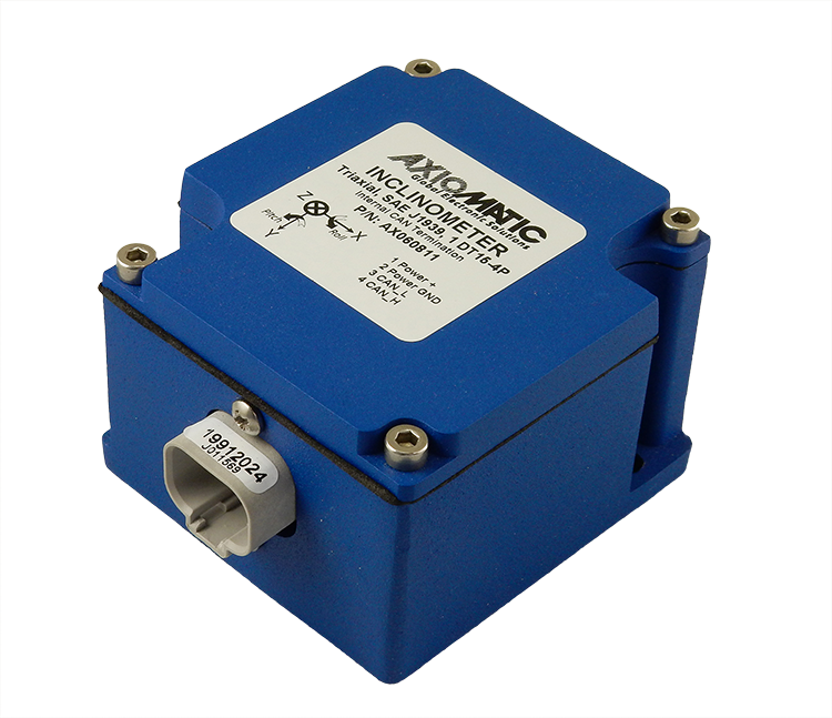 The inclinometer is IP67 rated and is packaged in a cast Aluminum housing with 1 TE Deutsch p/n DT15-4P connector.